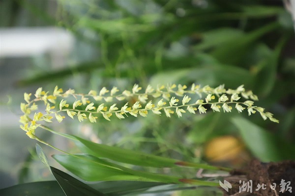 橱窗内的另一种“招牌兰花”——菲律宾穗兰也开花了,只见它细长的花序上密布黄绿色的小花,自然下垂状如一挂鞭炮,又像长长的流苏,非常吸睛。在一众争奇斗艳的兰花面前,菲律宾穗兰虽然颜值并不出众,却以奇特的造型令人难忘。