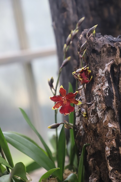 在兰花室隔壁的热带雨林室,唯一一株火焰兰依然“活力全开”,热带兰以色彩缤纷著称,尽管如此,火焰兰在众多热带兰中依然能以独特的颜色让人一下挪不开眼。火焰兰颜色红红火火,如火焰般深邃绚丽,形状也似火苗,远看就像一团浓艳的火焰,观赏价值很高。