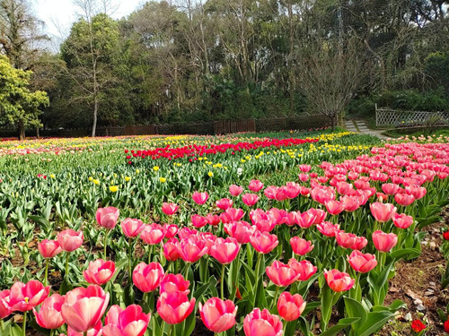 武汉植物园以现有生态景观为依托,结合地势地形和生境特点,打造郁金香林下景观、水系景观、平地景观。平地景观以经典的花海、花田的形式布局,展示郁金香丰富的品种资源和色彩特点。水系景观打造自然错落、意韵流动的滨水景观。林下景观充分考虑郁金香与草坪、树木的环境相容,再现“林地花溪”“林地花径”的唯美意境。五个展区各具特色,共同表现郁金香的色彩美、艺术美、生境美。同时,园方充分考虑人行游线,将游览路线融入展区中,打造“风景美如画,人在画中游”的生态画卷。色彩缤纷的郁金香等花卉,与清幽茂盛的树林、开阔青碧的草地、静谧秀丽的湖水、蜿蜒纵深的林径一起,交融出生机盎然、绚丽多姿的自然风情。