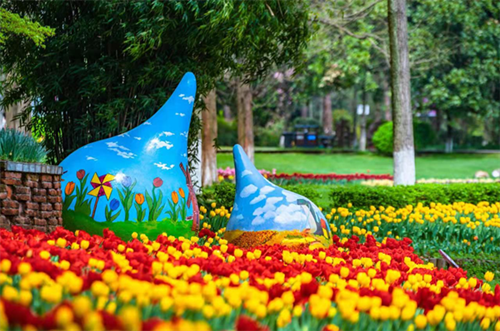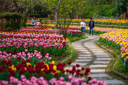 在菊花圃,各色的郁金香条带堆金叠翠、层层递进,形成连绵不绝的郁金香花海。盛开的郁金香,让人心生喜悦,形成繁花似锦、喧妍夺目的春日胜景。
