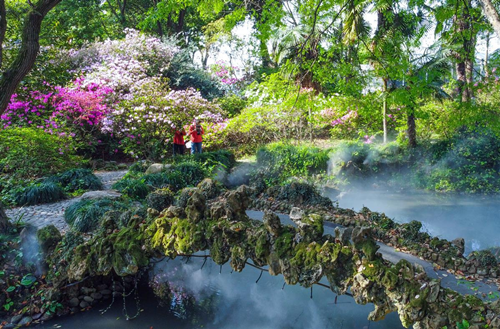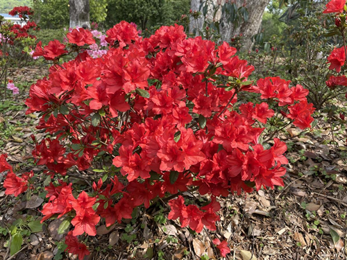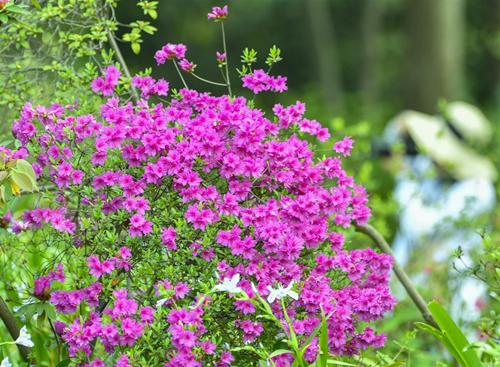 鲜艳的锦绣杜鹃在园内小径笑迎着你