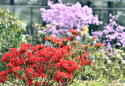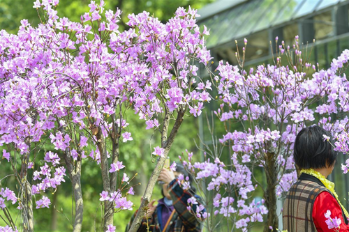 “粉嫩小巧的满山红花团锦簇,乍看确实像樱花,嫩粉映玻璃,这就是我想要的唯美效果。”韩艳妮欣喜不已。 满山红桩景引领的这片杜鹃花带,藏着杜鹃故事,“鲜橙的‘红皇冠’,粉嫩重瓣的‘王妃’,玫粉的‘日舞’,水红的‘公主’,它们可以演一幕戏剧了。”游客黎先生从这些杜鹃的美名中发现花间趣事。
