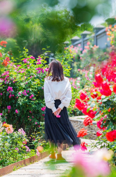 7000株月季正开得热烈,有白色、黄色、橙色、绿色、蓝色、粉红、红色、黑色、复色9个色系。全园收集栽培了大花月季、丰花月季、微型月季、藤本月季、地被月季、树状月季等多个种类,有“绯扇”“粉扇”“黑珍珠”“绿星”“红双喜”等200多个品种。只见拱门上、围墙边、路缘边,密密匝匝开满花朵,绚丽的色彩流动,芳菲浸染,目之所及美不胜收,随手一拍就是元气清新大片。