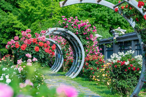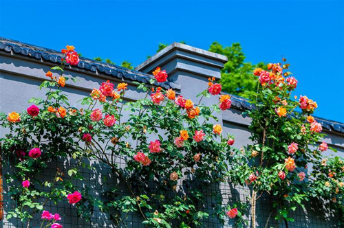 拱门上、围墙边、路缘边,密密匝匝铺满花朵,绚丽的色彩流动,芳菲浸染,目之所及美不胜收。