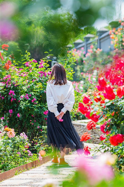 7000株月季热烈盛放,白、黄、橙、绿、蓝、粉、红、黑和复色9个色系的月季姹紫嫣红,描绘一幅多彩自然画卷。