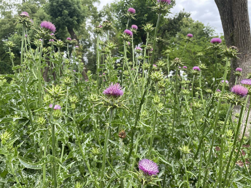 水飞蓟,带刺叶片托举着紫球花,“3月份时,它还趴在地上不起眼,不到两个月,就长得一人高。”徐文斌分享自然神奇力量。