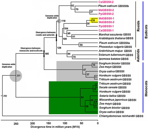 相关研究论文Diversification of Genes Encoding Granule-Bound StarchSynthase in Monocots and Dicots Is Marked by MultipleGenome-Wide Duplication Events近期发表于国际权威期刊PLoS One (2010年影响因子4.411;TOP 30%)。