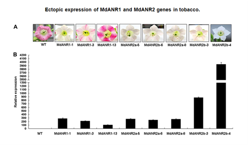 相关研究论文Introduction of apple ANR genes into tobacco inhibitsexpression of both CHI and DFR genes in flowers, leading toloss of anthocyanin近期发表于国际权威期刊Journal of Experimental Botany (2010年影响因子4.818;TOP 10%)。