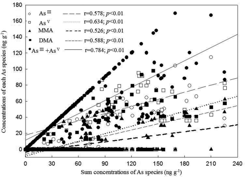 自然界中的砷元素以许多不同形态的化合物存在,其毒性取决于它的化学形态和种类,毒性较大的为无机砷(AsⅢ和AsⅤ),低毒性为甲基砷(DMA和MMA)。水稻生长在淹水厌氧环境中而更容易吸收富集砷,其颗粒对砷的累积导致大米成为人们一个重要的砷摄入途径。因此准确测定大米中砷形态及含量,进行风险评估具有重要的意义。