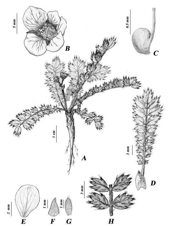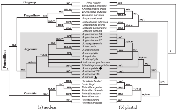 系统进化植物学科组冯涛博士在王恒昌和李建强研究员的指导下,开展了委陵菜族的系统分类学研究。在前期的物种采集和野外调查过程中,在西藏林芝地区海拔3300米的高山草甸发现了一类似山莓草属光叶山莓草(Sibbaldia glabriuscula)的居群。进一步的形态学研究表明此类群与近缘种光叶山莓草有明显区别,可以很好的界定为一新类群。运用核基因(ITS)和叶绿体基因(trnL-F)对新类群和相关属种构建系统发育树,结果表明此类群不属于山莓草属,应该归入新成立的Argentina属。结合形态学和分子生物学结果,将此类群描述为新种Argentina songzhuensis Feng &Wang。新种描述和其他野外工作为后续委陵菜族的系统分类学研究奠定了基础。