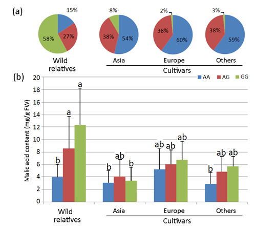 控制苹果酸度Ma1基因位点的低酸基因型(GG)在野生种中的频率显著高于栽培种
