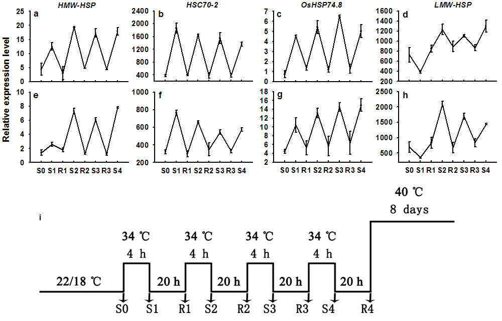胡涛博士在傅金民研究员的指导下,以课题组筛选鉴定的耐热高羊茅(PI 574522)和热敏感高羊茅(PI 512315)为材料,利用建立的逆境驯化模式对植株进行前期处理。与直接暴露40℃高温处理组相比,逆境驯化后两个高羊茅种质材料耐热能力显著增强,表现为草坪质量增加,EL值降低。进一步研究发现,逆境驯化主要抑制了PSII反应中心(PSII RC)能量流传递和OJIP相的下降,增加了叶片中4个有机酸,8个糖类物质,5个氨基酸和一个有机酸的含量。另外,我们对从NCBI数据中克隆的29个受高温诱导的热激蛋白基因转录水平进行检测,发现1个低分子量(LMW-HSP)和1个高分子量(HMW-HSP)热激蛋白基因在第二次高温驯化后表现出比第一次高温驯化更高的转录水平,而去除逆境驯化表达水平能迅速恢复到初始水平,具有transcriptional memory,我们称为驯化基因。