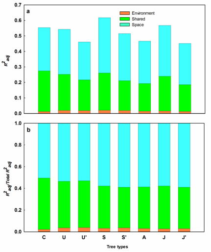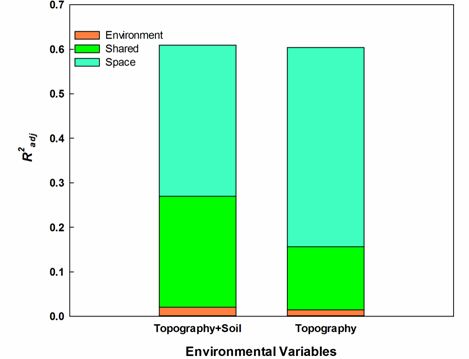 中国科学院武汉植物园植被生态学学科组乔秀娟副研究员等,利用八大公山25ha动态定位样地物种清查数据,使用distance-based Moran’s eigenvectors maps (dbMEM) 和 redundancy analysis (RDA)方法,分解了环境要素和空间距离对样地内物种周转的相对影响,并计算了每个样方内的局地β多样性。结果表明,环境和空间因子可以解释群落组成β多样性的60%的空间变异。土壤因子单独可以解释物种空间变异的21.6%,略高于地形因子的单独解释量(15.7%)。地形和土壤总共解释β多样性变异的27%,稍低于空间距离的解释量(34%)。基于现有的环境数据,八大公山群落结构受到中性过程和生态位过程的共同影响。