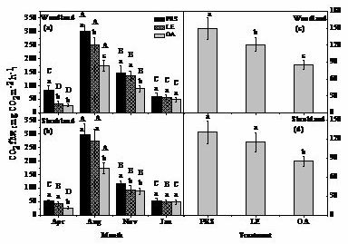 不同处理下森林和灌木土壤CO2释放的季节动态