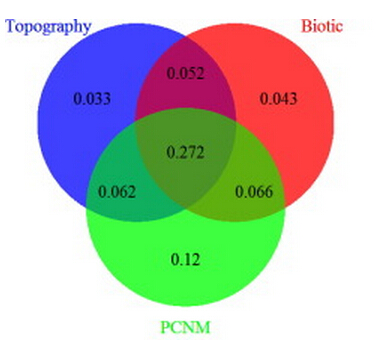基于该模型,对25公顷样地生物量进行了估算,并利用主坐标邻域矩阵(PCNM)和方差解析方法对环境和空间因子对生物量空间变异进行了分解。发现:样地平均生物量为252.7 Mg/ha,生物量在样地里呈现斑块化分布并且与地形有较高的相关性,其中大树(DBH≥25 cm)可以解释71%的生物量空间变异。方差分解结果显示,环境和空间可以解释64.8%的生物量变异,其中生物(43.3%)略高于地形因子(41.9%)。在生物因子中,树密度和木材密度分别能解释39.6%和3.8%的变异;在地形因子中,凹凸度和地形湿度指数分别可以解释38%和4%的变异(Forest Ecology and Management,2015, 357: 95–103)。