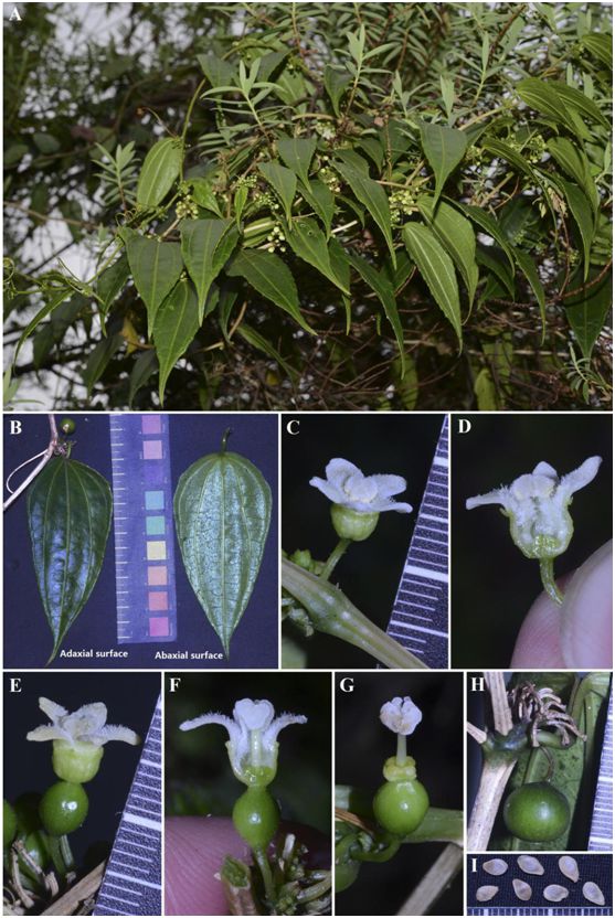 近革叶马交儿瓜(Zehneria subcoraicea Y.D. Zhou & Q.F. Wang)。A. 植株;B. 叶(腹面和背面);C & D. 雄花;E, F & G. 雌花;H. 果实;I. 种子