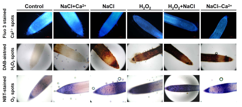 图1. 根中Ca2+,H2O2和O2.组织化学分析