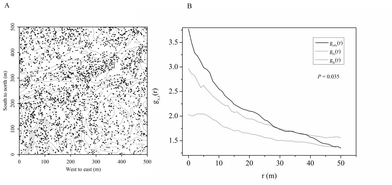 八大公山25 ha森林样地内枯立木分布散点图(A)和点格局分析(B)