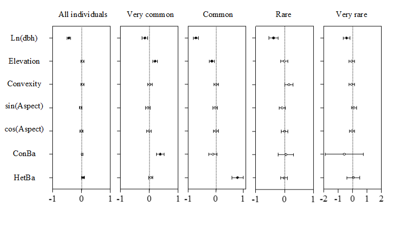 八大公山25 ha样地群落水平上全模型中各变量对树木死亡影响的估计系数(±2 SE)