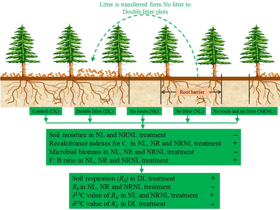 本研究得到国家自然科学基金 (31470557, 31270550, 31130010)和中科院战略先导专项B(XDB15010200)的资助,相关研究成果以“Does short-term litter input manipulation affect soil respiration and its carbon-isotopic signature in a coniferous forest ecosystem of central China?”为题发表在国际SCI期刊 Applied Soil Ecology上。
