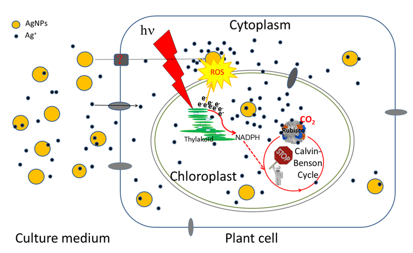 纳米银诱导水生植物在光合作用过程中产生活性氧的示意图