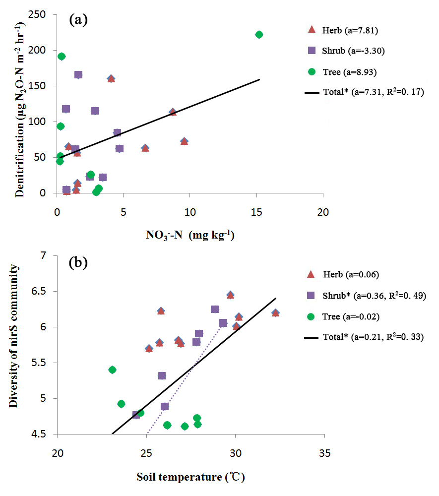 中科院武汉植物园副研究员叶琛在张全发研究员的指导下,以三峡水库消落区忠县植被恢复区为对象,针对三峡库区消落区夏季出露时的水文变化的四个阶段(即淹没、饱和、落干和再淹没)开展原位水文变化的模拟,研究水文变化和植被类型对土壤反硝化作用的影响及其微生物学机理。研究发现水文变化显著影响土壤的反硝化作用,可能主要是通过改变土壤的硝态氮含量来实现,其中在乔木区,反硝化速率在淹没状态显著高于落干和饱和状态。水文变化和植被类型均对土壤反硝化菌的nirS 和nirK基因丰度和多样性产生显著影响。其中水文变化主要通过改变土壤温度、湿度和铵态氮含量对反硝化菌产生影响,不同植被类型通过改变土壤pH、质地、有机碳和C:N来影响nirS 和nirK基因丰度和多样性。但是,土壤反硝化作用与反硝化细菌群落结构不存在显著的相关关系,表明消落区土壤反硝化作用主要受到环境因素的影响。该研究也揭示了草本和乔木具有潜在提高消落区净化水质的功能,主要分别通过提高土壤反硝化菌的丰度和土壤反硝化作用来实现。