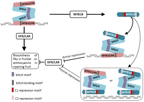 花青素和原花青素(PA)是决定果实外观和营养品质的主要成分,其合成受MYB调节基因控制,其中MYB基因包含正调控和负调控两种类型。中国科学院武汉植物园果树分子育种学科组在韩月彭研究员带领下发现一个桃负调节基因PpMYB18抑制果实中的花青素和PA积累。在桃果实发育过程中,幼果期以PA积累为主,而成熟期大量积累花青素。有趣的是,在这两类次生代谢物合成的同时,MYB正调节基因也激活PpMYB18基因的表达形成一个负反馈环(见下图),抑制花青素或PA的过度合成,起着平衡果实次生代谢物积累的功能。研究还揭示了PpMYB18蛋白与正调节MYB蛋白竞争结合bHLHs抑制花青素或PA合成的分子机理,以及决定PpMYB18蛋白抑制活性的关键结构域。