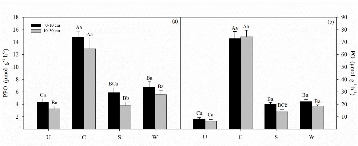 中国科学院武汉植物园土壤生态学学科组博士研究生张倩在程晓莉研究员的指导下,以丹江口库区荒地、农田、灌丛和森林为研究对象,测定不同土地利用方式下土壤中碳水解酶活性和氧化酶活性以及碳含量的变化。研究结果表明,植被恢复和耕种均显著提高了土壤的碳水解酶活性和碳氧化酶活性。造林地碳水解酶活性的增加主与其较高的土壤可溶性有机碳含量以及易分解碳含量有关,而农田则与其较低的土壤碳氮比以及翻耕、施肥有关。农田土壤氧化酶活性显著高于造林地,这可能是由于其较高的惰性碳指数和较低的碳氮比造成的。同时农田土壤单位有机碳酶活性显著高于造林地,这表明造农田的碳周转速率显著高于造林地。研究表明造林可以通过减缓由土壤酶驱动的碳周转提高土壤碳的封存和土壤碳的稳定性。