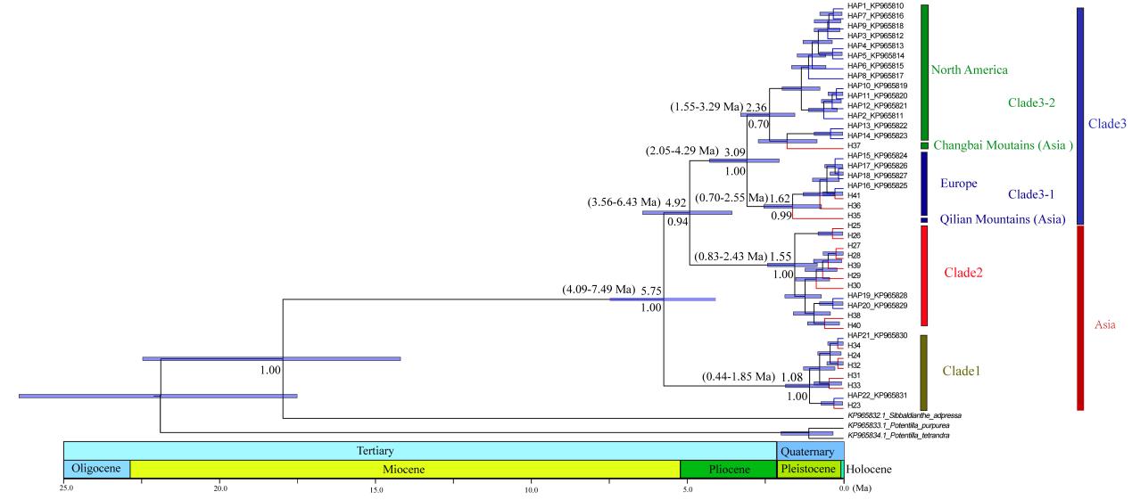 图2:广义山莓草单倍型构建系统进化树,分子钟估算分化时间。