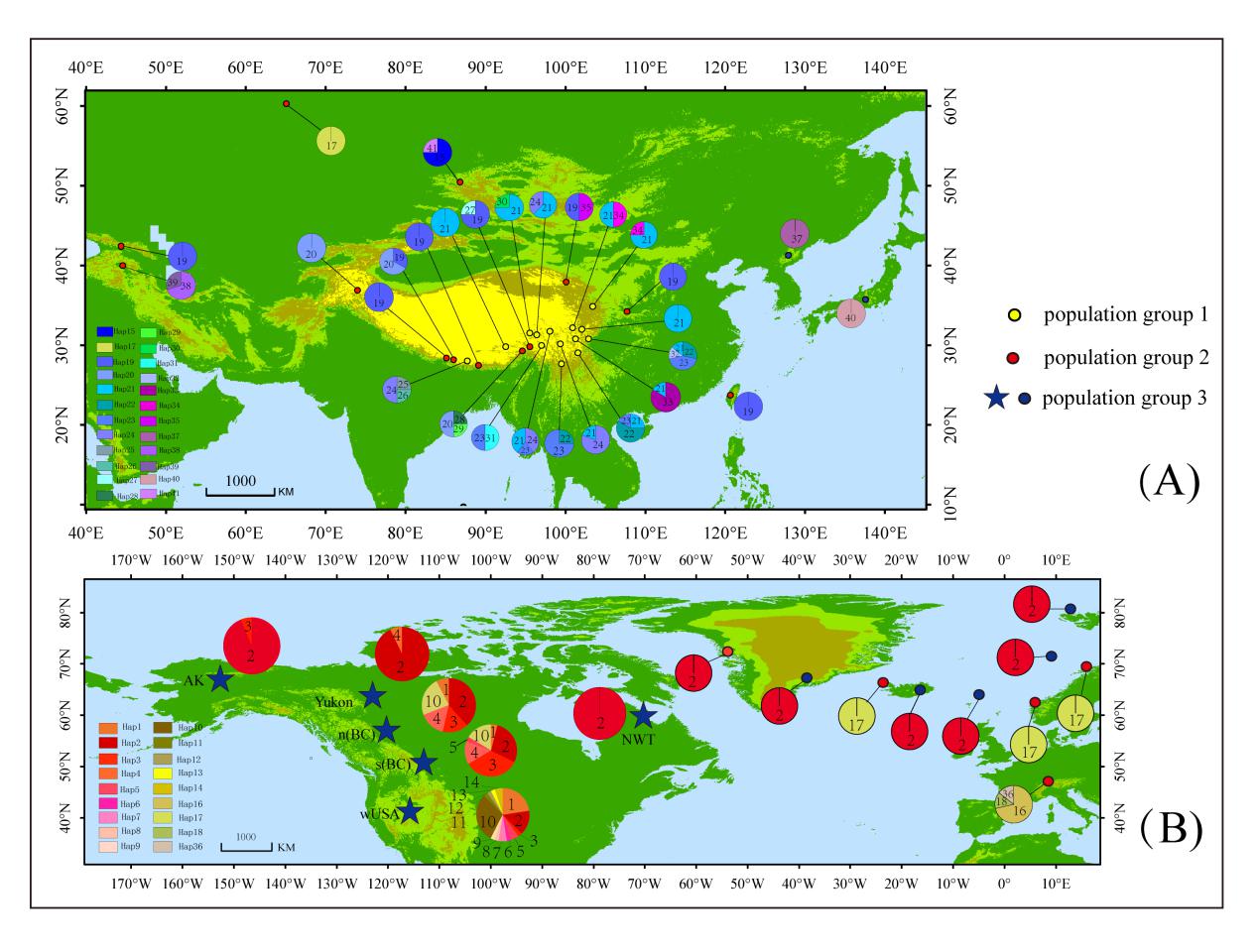 图1: 广义山莓草单倍型在北半球的地理分布图