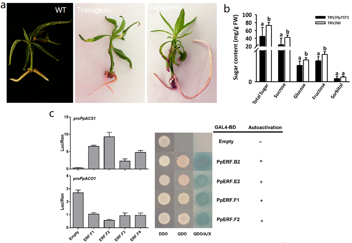 图1 a, 桃复合植株(非转基因芽+转基因根系);b, PpTST对果实糖积累量的影响;c,PpERF对乙烯代谢通路基因的调控作用。