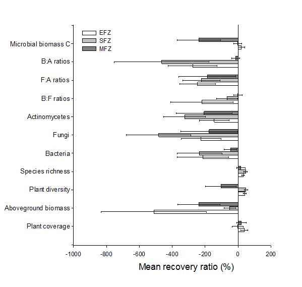 不同的淹没时间下消落区植被和土壤微生物群落平均恢复率的差异