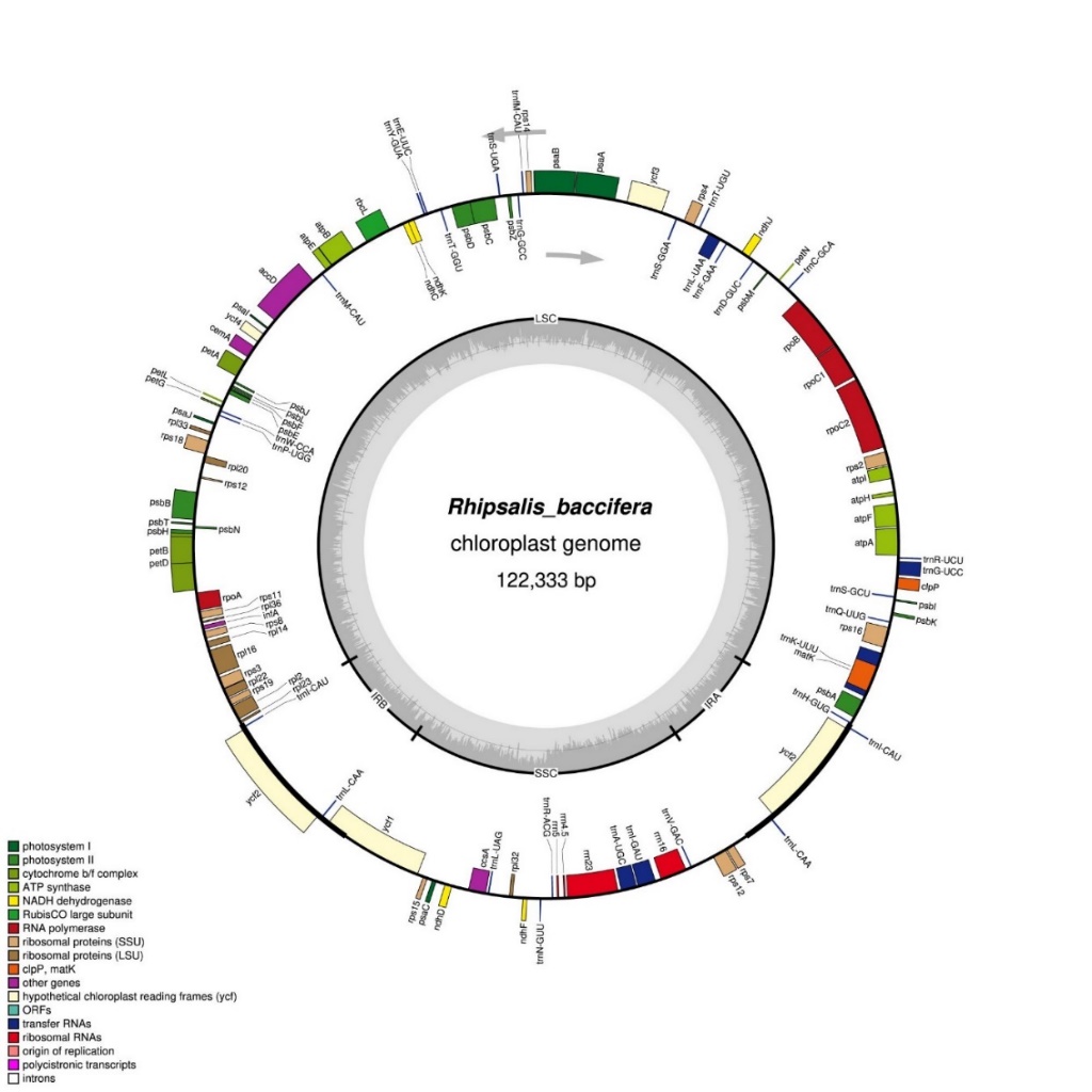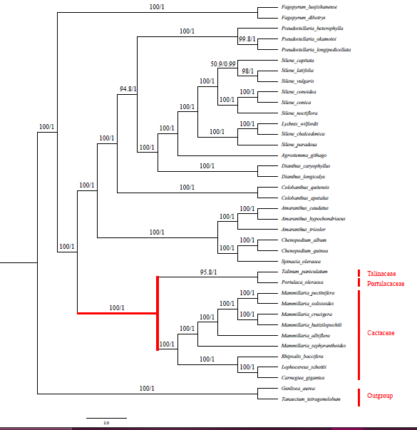 仙人掌科(Cactaceae)是美洲干温地区被子植物中最著名、种类最丰富的科之一。该科为单系,隶属于石竹目马齿苋亚目。在该目中,仙人掌科形成了一个单独的分支,其与土人参属、马齿苋属和Anacampseroteae科合称为ACPT分支。该分支的基部位置为土人参属,该属与由Anacampseroteae科、仙人掌科和马齿苋属组成的亚分支构成姐妹群。然而,该分支成员之间的系统学关系仍不清楚。仙人掌科植物几乎都是新大陆的特有种,只有附生植物丝苇(Rhipsalis baccifera(J.S.Muell.) Stearn)在新大陆和旧大陆都有自然分布。因此,本科中这个具有独特分布式样的物种吸引了许多研究人员的注意。然而,目前该物种在分子层面的研究还不充分,未见关于该物种叶绿体全基因组分析的报道。