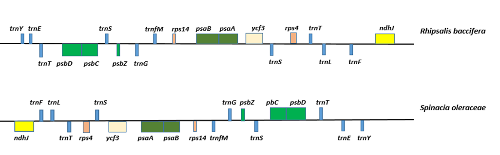 图2. 丝苇叶绿体基因组大单拷贝区(LSC)中ndhJ- trnY基因间的19个基因倒置,其基因组与spinacia oleraceae进行比较
