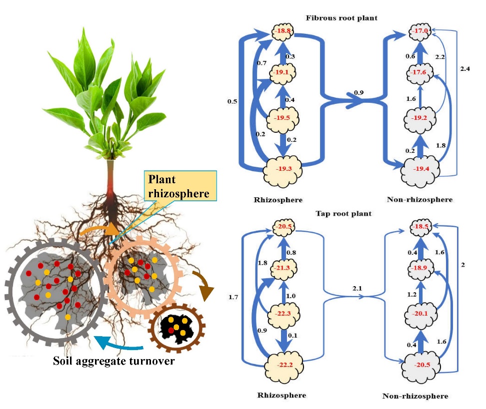 武汉植物园研究生李俊雅在刘毅老师的指导下,在河南丹江湿地国家级自然保护区内,对须根系和直根系植物的根际和非根际土壤进行采样分析,研究不同粒径团聚体中的稳定性分布、SOC含量和δ13C动态去向。结果发现:根际效应显著提高了土壤团聚体的稳定性,显著促进了土壤团聚体固碳。稳定同位素分析发现,SOC会随着土壤团聚体周转在不同大小团聚体中迁移流动,总的流动方向表现为从大团聚体向小团聚体流动,且根际区域内团聚体间C的流动大于非根际。对于土壤团聚体稳定性和有机碳的固定,须根系植物的根际效应明显强于直根系植物。