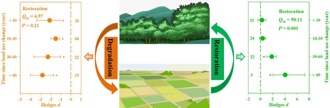 武汉植物园科研人员通过对收集到已发表的83篇植被退化和恢复对甲烷氧化影响的研究论文进行数据整合分析(meta-analysis),从全球角度分析了土壤甲烷氧化潜力对植被退化和恢复的响应。结果表明:土壤甲烷氧化对植被退化和恢复的响应是非对称的。主要表现在两个方面:第一,植被退化导致的土壤甲烷氧化降低幅度大于植被恢复使土壤甲烷氧化潜力提升的幅度;第二,土壤甲烷氧化潜力在短期的植被退化背景下显著降低,并且植被退化对甲烷氧化潜力的负效应不随着退化年限的增加而改变;然而,土壤甲烷氧化潜力随着植被恢复时间的增加而增加,并且短期的植被恢复(< 30 years)不足以提升甲烷氧化潜力。该整合研究,不仅能够为可持续的土地管理提供一定参考,还有助于减少土壤甲烷氧化潜力对全球土地利用变化响应的不确定性。