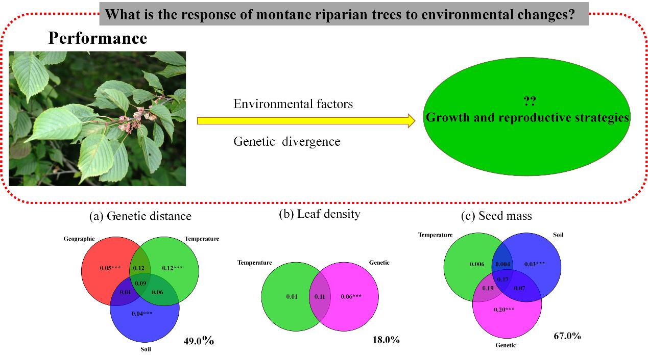 基于前期的研究基础,植被生态课题组研究人员通过整合遗传、性状和环境数据,探究环境梯度上领春木的适应策略及潜在的机制。结果表明:(1)地理隔离和环境隔离效应共同作用于种群间的遗传差异,而环境隔离效应可以解释种群间的性状差异;(2)低纬度地区分布的领春木采取资源保守生长策略(resource conservative strategy)并表现出较高的萌蘖能力,而高纬度地区分布的领春木采取资源获取生长策略(resource acquisitive strategy)并生产质量较轻的种子。中国分布区尺度上,领春木生长和繁殖策略是对特定环境的适应,萌蘖性状(可塑性)是对季节性洪水的响应,而种子质量和叶片密度差异是(局域适应)土壤和温度因子定向选择的结果。