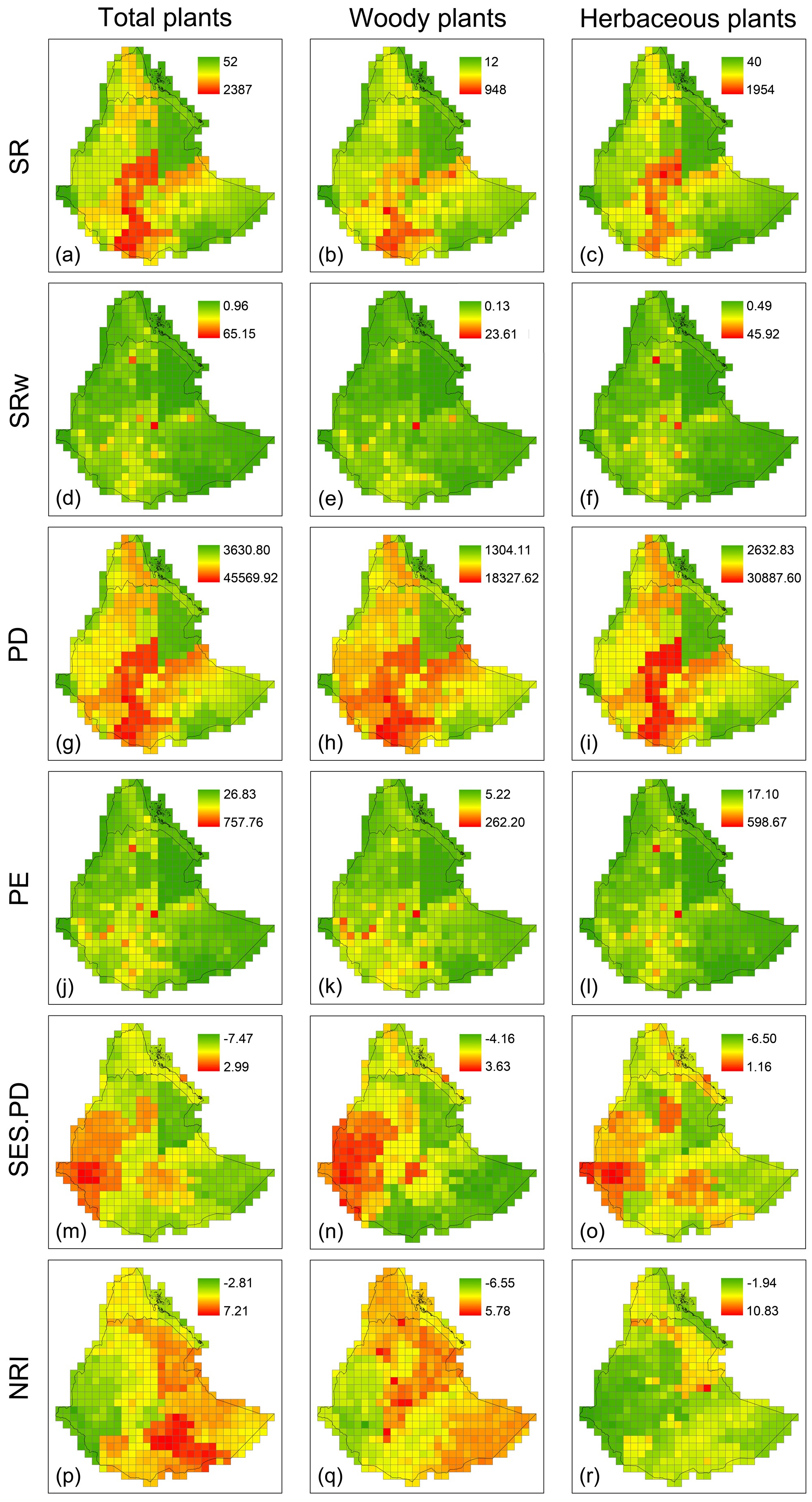 基于此重构的数据库,在武汉植物园副主任、中-非联合研究中心主任王青锋研究员的指导下,中国科学院植物种质创新与特色农业重点实验室、中科院武汉植物园植物多样性与进化学科组周亚东副研究员等又将所有数据分为3个子数据集,包括全部物种、木本植物和草本植物,分析和比较了该地区3个子数据集的植物多样性的6个主要指数的空间格局:包括物种丰富度(SR)、加权的物种丰富度(SRw)、系统发育多样性(PD)、系统发育特有性(PE)、标准化系统发育多样性(SES.PD)、净种间亲缘关系指数(NRI)。