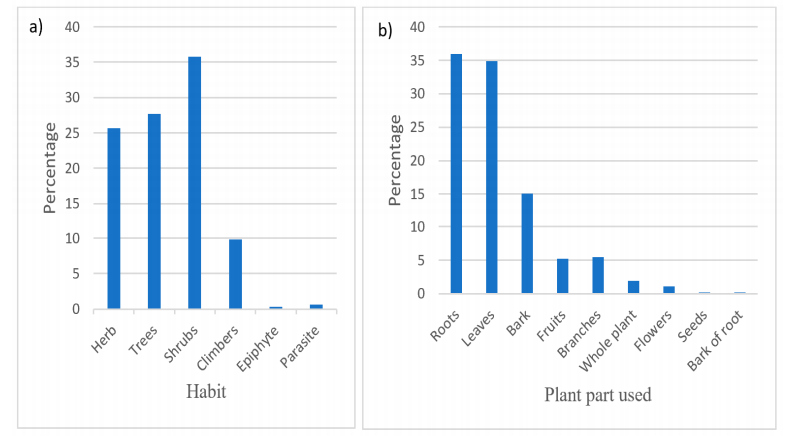 图2. 切兰加尼山区药用植物的生活性(a)和使用部位(b)