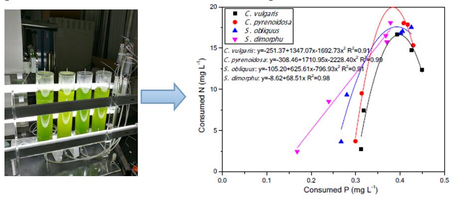 不同微藻之间均存在着明显的生理特性差异,对废水有着不同的适应特性。因此,在同一种培养体系中可能会有着不同的生长量和氮磷去除率。武汉植物园科研人员研究了4种微藻(普通小球藻、蛋白核小球藻、斜生栅藻和二形栅藻)在污水厂尾水中生长、对氮磷去除及其油脂生长情况,以期可以得到一种可在尾水中获取最大的微藻生物量。