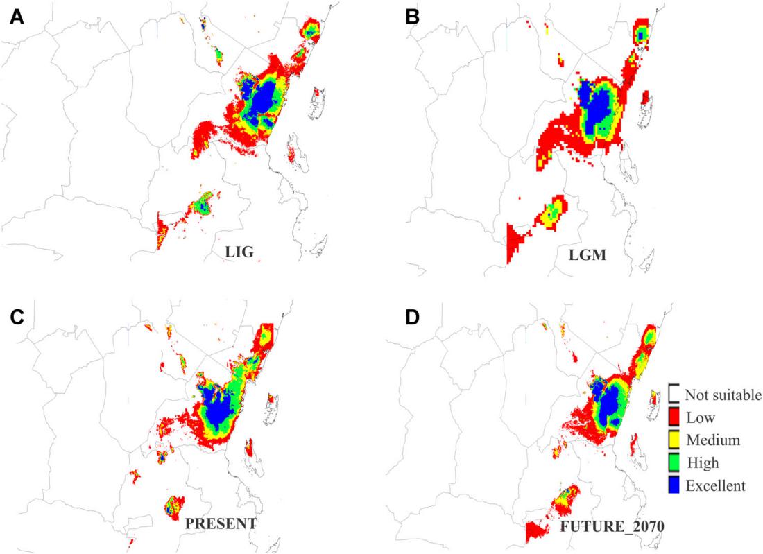 图3. Str. ionanthus的生态位模型(ENM)。A:末次间冰期气候条件(末次间冰期~120000年前),B:末次冰盛期(末次冰盛期~21000年前)。C:现状(1960–1990年)。D:2070年的预测。