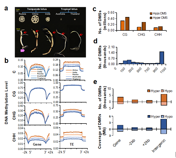 特色水生经济植物莲其自然分布区包括两种分别适应高低纬度气候环境的生态型:温带型(亚洲高纬度温带及寒带)和热带型(亚洲及澳大利亚北部低纬度热带)。莲的地下茎俗称藕或藕带,是常用餐菜之一,也是区分温带型(地下茎膨大成藕,具有明显的年生长发育周期)和热带型莲(地下茎鞭状不膨大,常年无明显停顿生长)的重要器官,其表型分化体现了莲表型对不同纬度气候环境的适应性进化。DNA甲基化修饰是一类重要的表观遗传修饰,其中胞嘧啶残基第5位碳原子上的甲基化现象是研究最广泛的表观遗传修饰。甲基化在不改变DNA序列的前提下,可以影响植物的基因表达和表型,从而参与了植物生长发育。然而,可能影响莲两生态型地下茎表型适应性分化背后的DNA甲基化修饰表观遗传机制尚不明确。
