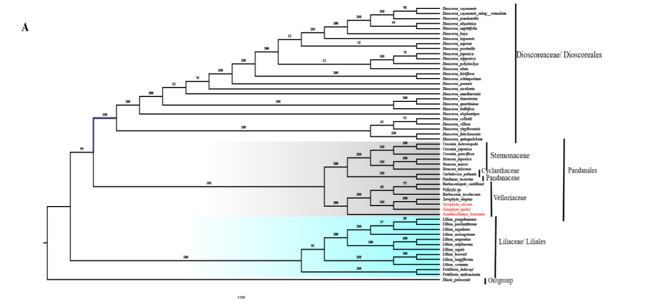 中国科学院武汉植物园东非植物区系与分类学科组对采自我国横断山区的芒苞草的叶绿体全基因组进行了分析,并与两个产自非洲的黑炭木属植物Xerophyta spekei和X. viscosa进行了叶绿体全基因组序列和形态上的比较研究。研究结果显示,芒苞草和黑炭木属的Xerophyta spekei和X. viscosa的叶绿体基因组全长分别为153,843 bp,155,235 bp和155,498 bp。叶绿体基因组由反向重复区(IRS)(IRa和IRb)、大单拷贝区(LSC)及小单拷贝(SSC)区组成,上述三个物种的反向重复区序列长度在27,022 bp到27,110 bp之间,大单拷贝区(LSC)长度在81,919 bp至83,813 bp之间,小单拷贝(SSC)区长度在17,387 bp至17,880 bp之间。利用叶绿体基因组数据进行的系统发育分析表明,芒苞草是翡若翠科其余物种的姊妹群,是该科较早分化出来的物种(图1)。分析结果强烈支持芒苞草与非洲翡若翠科的类群聚为一支,表明芒苞草与翡若翠科其他类群的近缘关系。