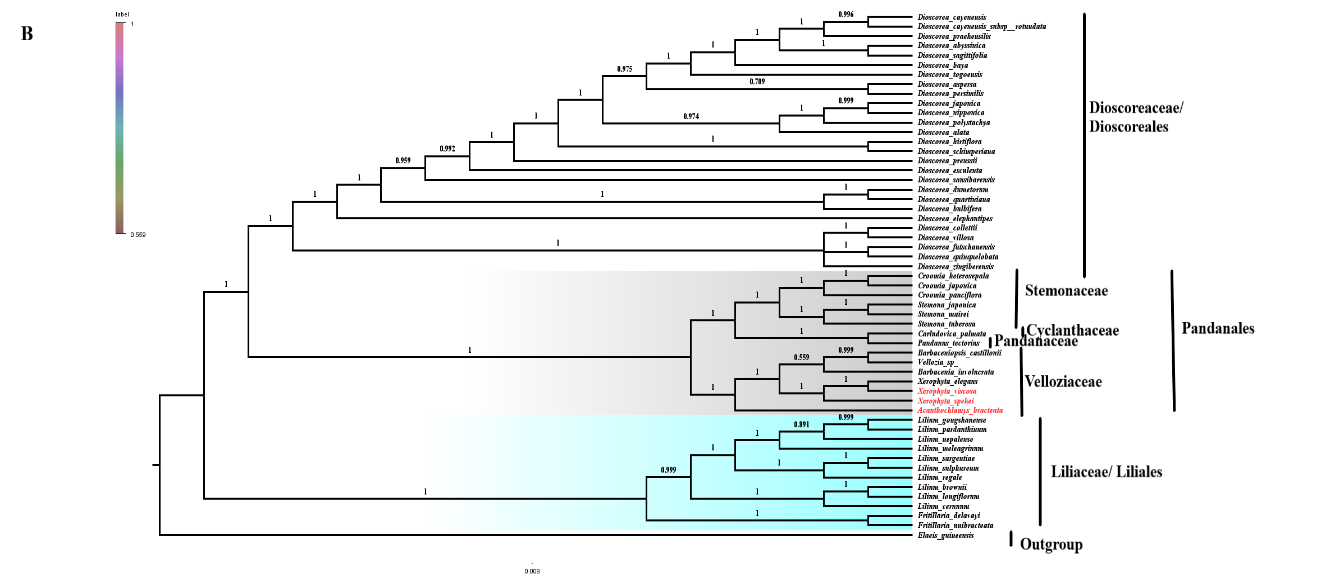 研究成果以 “Complete Chloroplast Genomes of Acanthochlamys bracteata (China) and Xerophyta (Africa) (Velloziaceae): Comparative Genomics and Phylogenomic Placement” 为题,发表在国际植物学期刊Frontiers in Plant Science上, 本项工作得到了中国科学院国际合作计划项目(151853KYSB20190027)、中国科学院中-非联合研究中心项目(SAJC202101)和中国科学院大学博士生奖学金项目ANSO青年人才奖学金的资助。