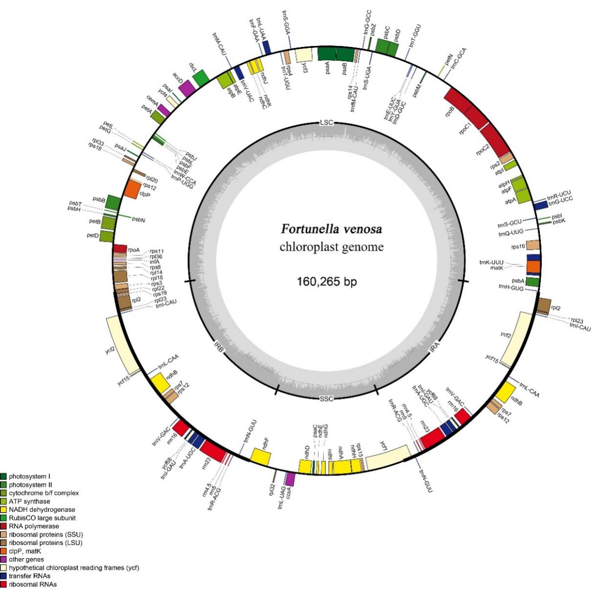 图1:金豆(Fortunella venosa (Champ. ex Benth.) C.C.Huang)叶绿体基因组基因图谱。
