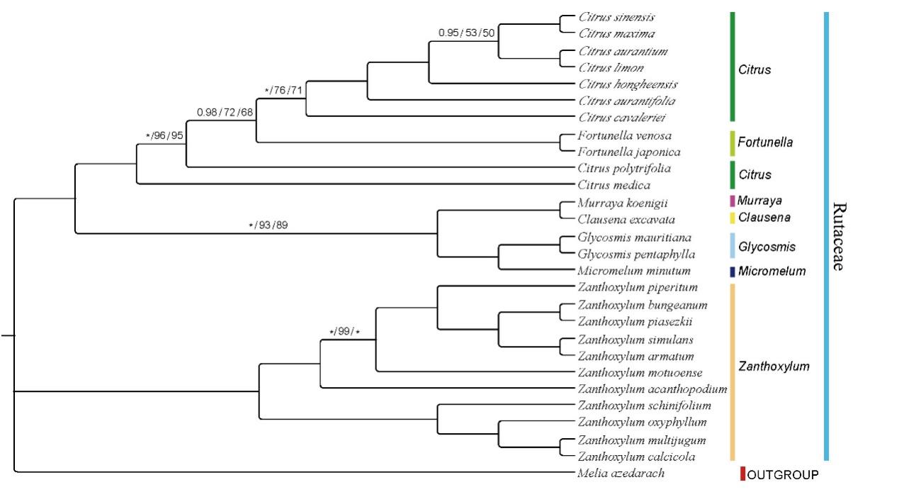 图3:基于叶绿体全基因组序列的27种芸香科植物BI系统发育树