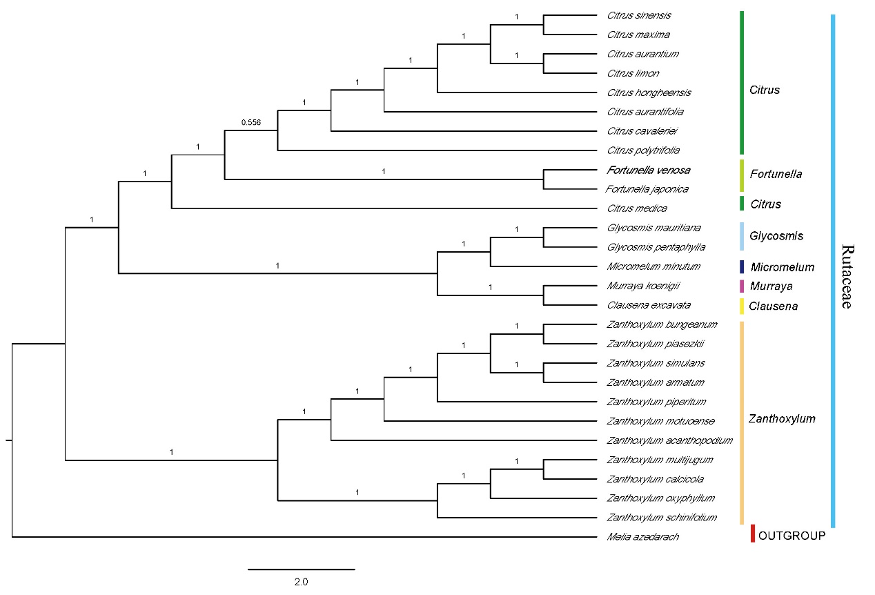 本研究以“Complete Chloroplast Genome Sequence of Fortunella venosa (Champ. ex Benth.) C.C.Huang (Rutaceae): Comparative Analysis, Phylogenetic Relationships, and Robust Support for Its Status as an Independent Specie”为题发表在国际林学期刊Forests上。本研究得到了国家科技基础资源调查专项(2019FY101800)、湖南省林木种质资源调查项目(湘才农志(2015)91)和中国科学院国际合作项目(151853KYSB20190027)等项目的支持。湖南师范大学生命科学学院的硕士研究生王婷为本文的第一作者,胡光万研究员及蔡秀珍博士为通讯作者。