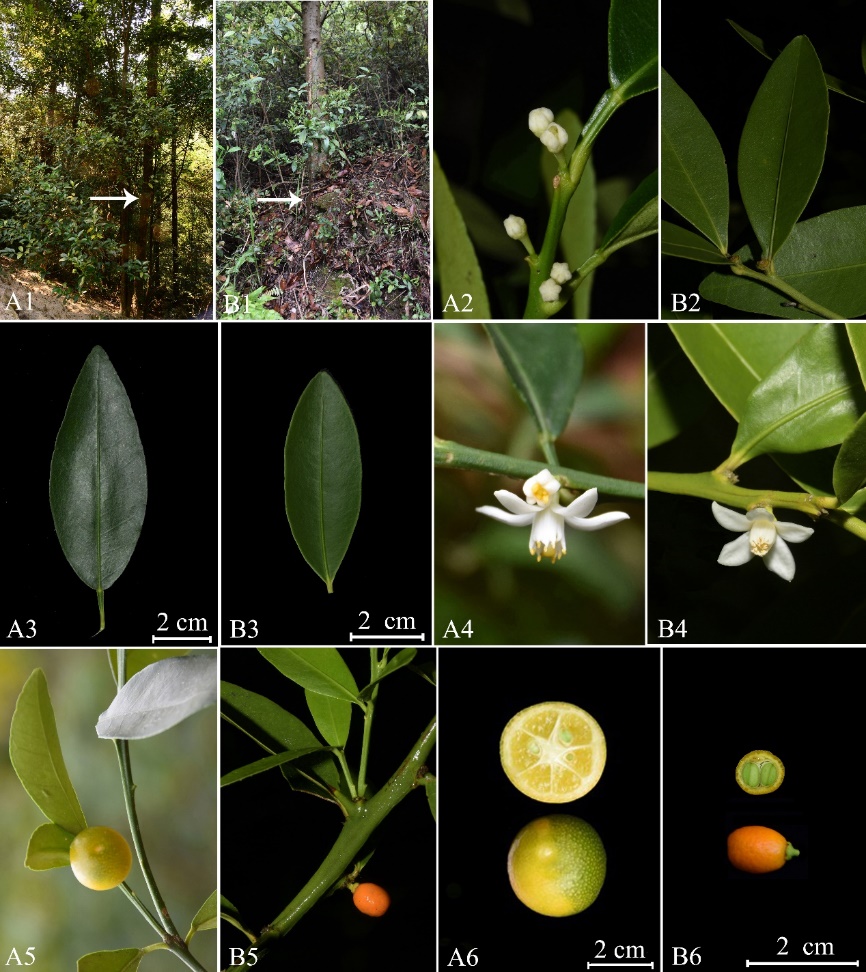 图4:金柑和金豆的主要形态结构比较 A金柑 B金豆 1.植株及生境 2.枝条 3.叶 4.花 5.果枝 6.果实及果实横切