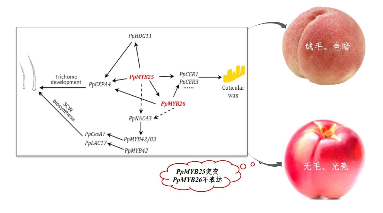 有趣的是,通过扫描电镜观察油桃和普通桃果实表皮特征,发现二者除了表皮毛差异外,表皮蜡质的结构也大不相同,随后的GC分析进一步证实了油桃和普通桃果实表皮蜡质含量存在差异。通过生理生化和转基因等一系列研究,发现PpMYB25激活下游同源基因PpMYB26的表达,它们共同促进表皮毛的发育和表皮蜡质的积累,从而使普通桃果实具有多毛灰暗的表皮。而在油桃中,由于PpMYB25基因失活,PpMYB26及其他表皮毛发育基因以及表皮蜡质合成基因表达随之受阻,表皮毛发育无法起始,同时表皮蜡质积累减少,使得油桃果皮呈现光亮无毛的表型。