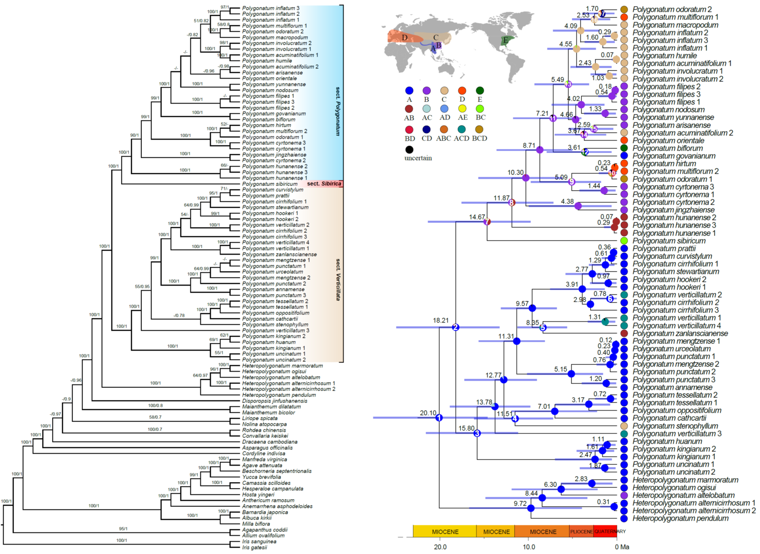 黄精属(Polygonatum)隶属于天门冬科(Asparagaceae)黄精族(Polygonateae),包含64个物种,其中,黄精、多花黄精、滇黄精等根茎不含淀粉,富含非淀粉多糖、低聚糖、皂苷、黄酮等营养和功效成分,具有重要药用价值。但目前黄精人工栽培种质混乱,分类系统不完善,黄精属的起源和演化过程仍不清楚。近日,武汉植物园东亚植物演化、保护与利用学科组邱英雄研究员团队在Molecular Phylogenetics and Evolution期刊发表题为“Out of the Himalaya-Hengduan Mountains: Phylogenomics, biogeography and diversification of Polygonatum Mill. (Asparagaceae) in the Northern Hemisphere”的研究论文。该研究利用叶绿体基因组数据构建了黄精属可靠的系统发育框架,重建了其生物地理历史,揭示了地质构造变化、环境因素、生物地理历史在物种分化和性状演化中的作用。研究结果促进了人们对北半球间断分布植物多样性形成的理解,对规范黄精属种质资源和研发种质鉴定技术提供了支撑。